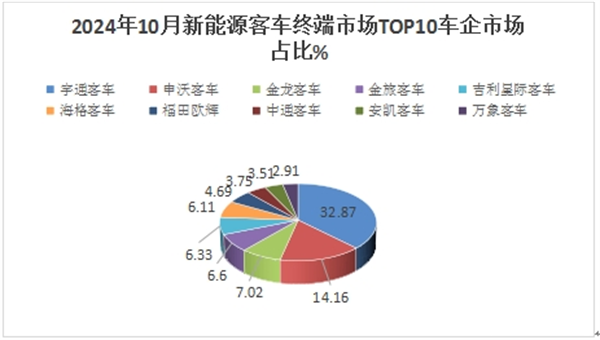 上图表显示,在2024年1-10月新能源客车终端累计销量中,宇通、海格、吉利星际居前三;其中宇通一家独大,是唯一销量超越6000辆的车企;前三车企市场占比分别为25.51%、9.83%和6.93%;另外,前10家车企累计销量均超1000辆。