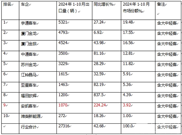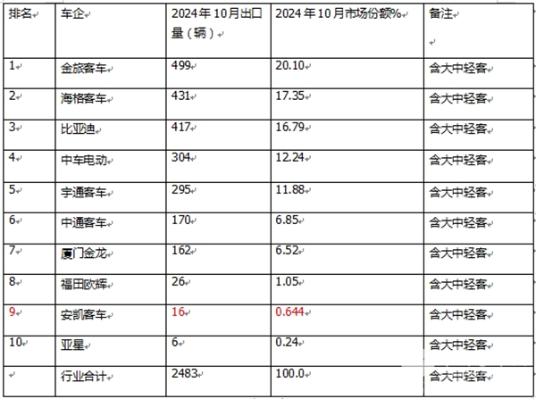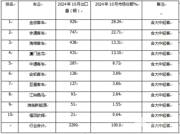 上表可见,2024年10月公交客车整体出口数量及市场占比: