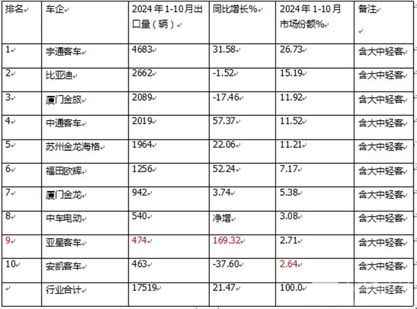 2024年10月及1-10月座位客车与公交客车出口排行出炉