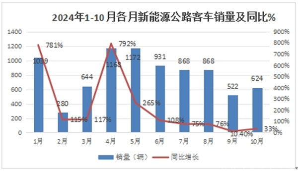 2024年1-10月新能源客车终端累计销售24104辆,累计同比增长9%,其中今年1-10月新能源公路客车终端累计销售8116辆,累计同比去年同期的3397辆增长139%,,也远远跑赢今年1-10月新能源客车终端大盘9%的累计同比增速近130个百分点。