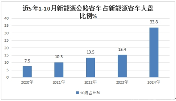 根据终端上牌数据,2024年1-10月新能源公路客车累计销售8116辆,占据今年1-10月新能源客车终端市场总销量24104辆超3成(33.8%)的份额,创下近5年同期新能源公路客车占比新高(见下图),因此成为今年1-10月新能源公路客车市场一个明显的特征。