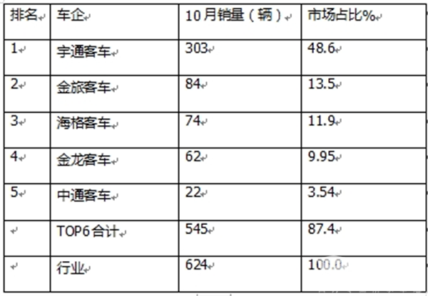 可见,“两通三龙”包揽了今年10月新能源公路客车市场的前五名。