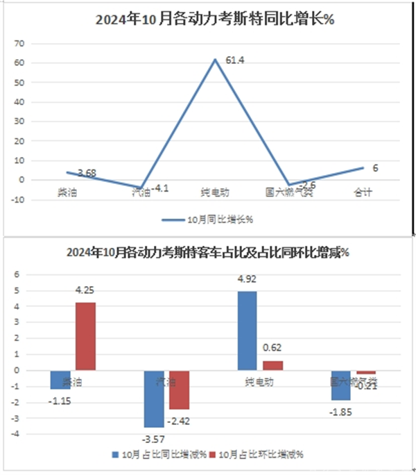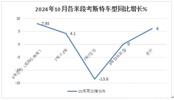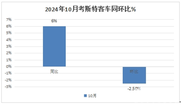 表1,根据终端上牌及中国客车统计信息网数据,2024年10月考斯特客车与6米以上大中型客车大盘同环比比较: