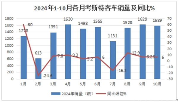 根据终端上牌数据,2024年1-10月各月考斯特客车销量及同比:
