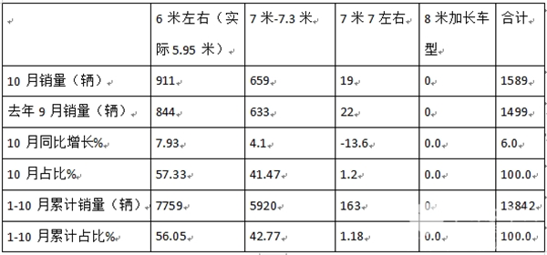 同时,今年1-10月6米考斯特客车累计销售7759辆,累计占比56.05%,也居于主体地位。