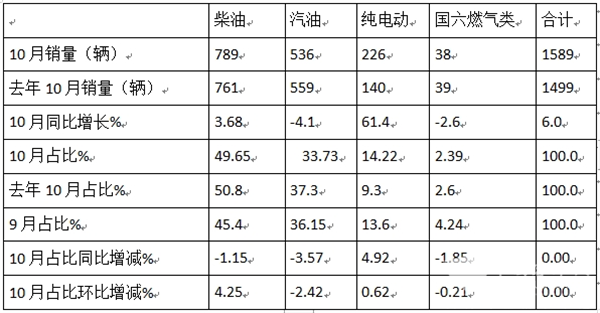 表4,根据终端上牌数据统计,按燃料种类划分,2024年10月考斯特客车销量结构及同环比增减: