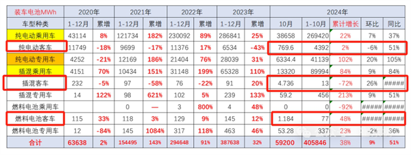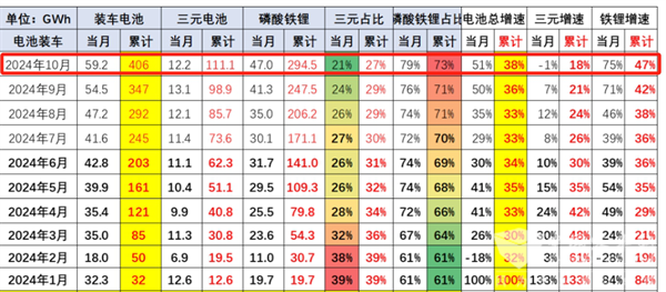根据中国汽车流通协会提供的数据(见截图1),2024年 10月我国动力电池装机量共计59.2GWh,同比增51%;