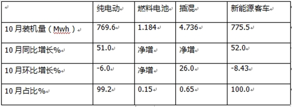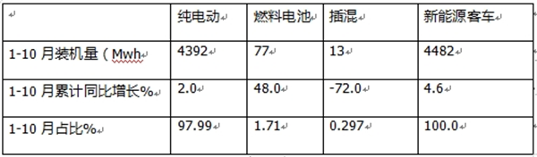 今年1-10月纯电动客车装机量处于恢复性增长主要得益于国家政策的驱动及纯电动公路客车的增长,加之新能源公交车以旧换新补贴政策的刺激所致。