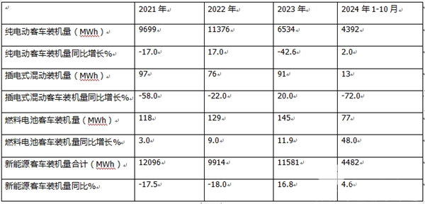 ----2024年1-10月插电式混动客车动力电池装机量居近4年最差,同比领跌