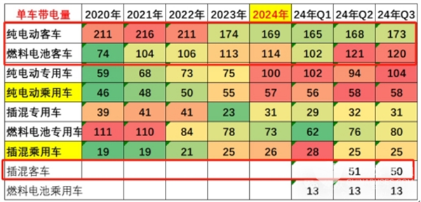 三、2024年1-10月各类技术路线新能源客车单车平均带电量简析