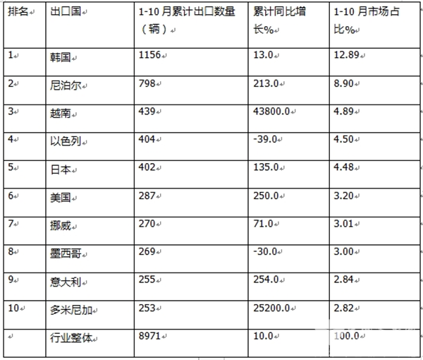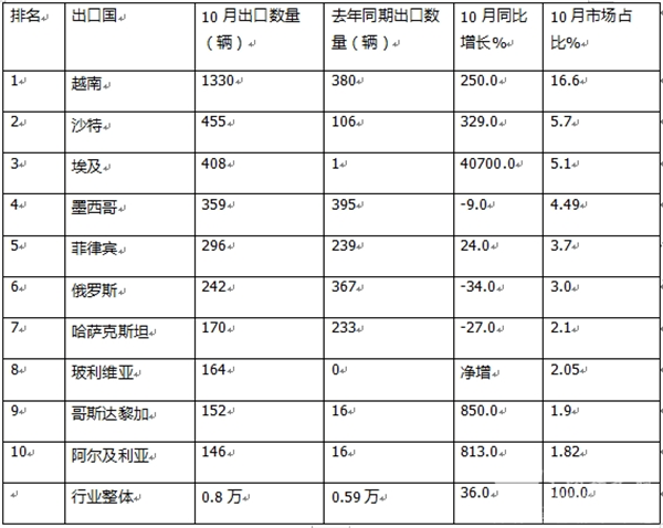 ---累计出口到越南5598辆,比第一名的沙特比较少1417辆,是今年1-10月进口我国客车数量第二多的国家,同比增长38%,跑赢客车出口大盘,市场占比8.61%,位居第二;