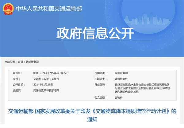 2024年11月27日,交通运输部、国家发展改革委联合印发《交通物流降本提质增效行动计划》的通知(下简称《通知》)。