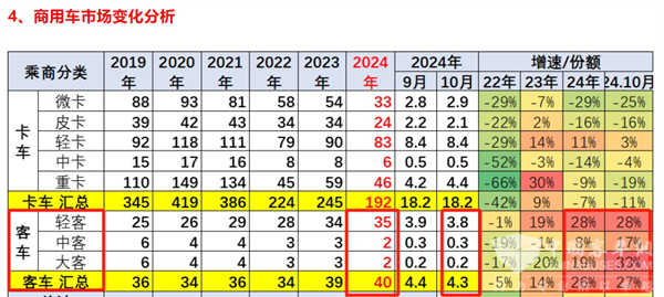 根据终端上牌数据,2024年10月国内客车累计销售4.3万辆,同比增长27%,其中轻型客车(含农村客车)销售3.8万辆,同比增28%(见截图1),同比增速高于今年10月国内客车大盘27%的增速近1个百分点。