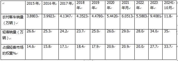 表2,根据终端上牌,2015年---2024年前10月农村客车销量及占据轻客市场的比例统计如下: