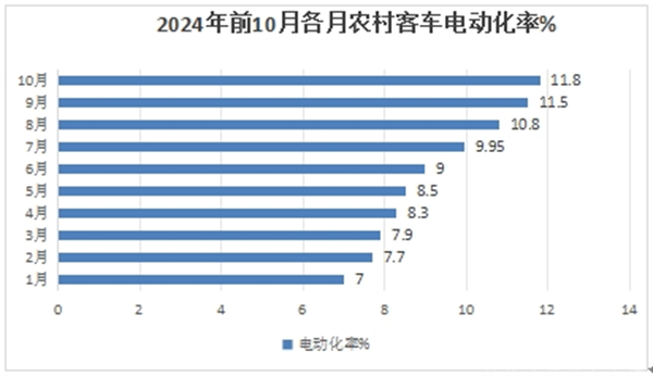 今年10月农村客车纯电动客车市场占比为11.8%,也就是说今年10月我国农村客车市场的电动化率达到11.8%,创下今年以来各月新高,并演绎了今年以来各月电动化率的“10连升”。