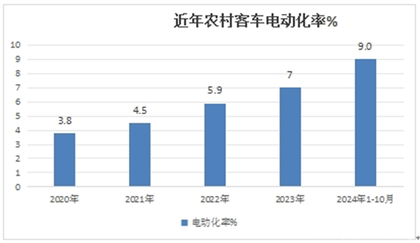 今年前10月纯电动客车市场占比为9.0%,也就是说今年前10月我国农村客车市场的电动化率达到9.0%;也创下近年来新高。