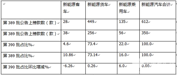 表1,根据工信部数据,第390批新能源汽车公告中各大类车型上榜数量及占比、占比环比增减: