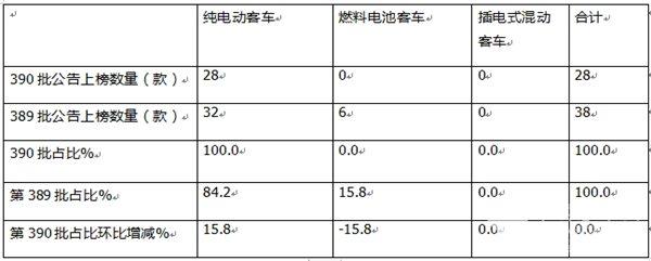 按汽车大类划分,第390批公告中上榜的新能源车型中,包括新能源客车28款,占比4.6%,占比环比减少6.26个百分点。