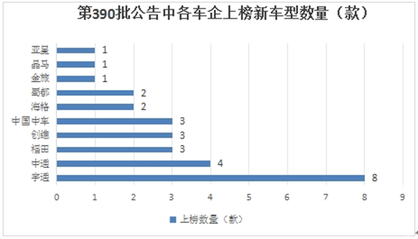 在第390批公告中共有10个客车品牌企业参与了新能源客车新品申报,各个品牌上榜数量统计如下: