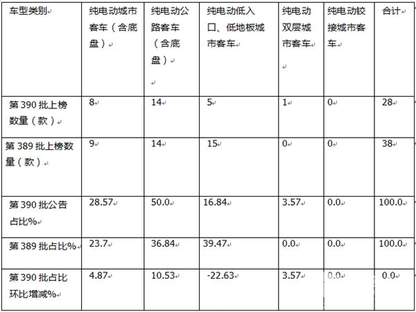 表3,根据第390批公告数据,按目标用途划分上榜的28款纯电动客车车型类别结构占比及占比环比增减统计: