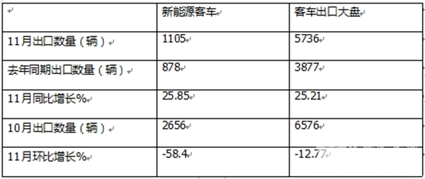 今年11月,我国新能源客车出口同环比均跑输我国客车出口大盘,成为遏制今年11月我国客车出口增长的最大力量。据分析主要是上个月新能源客车出口基数较高,给今年11月的新能源客车出口环比增长带来困难。