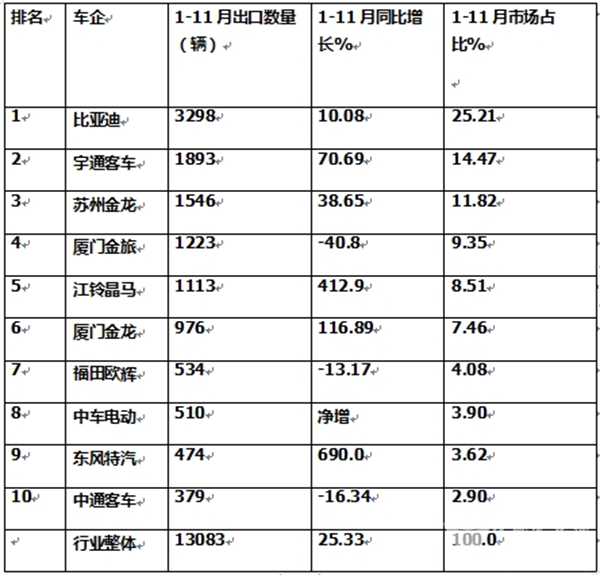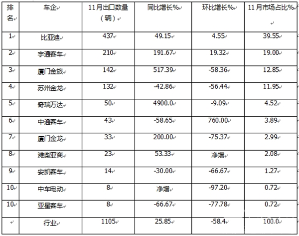 11月新能源客车出口:同比增环比“腰斩” 比亚迪强势夺冠