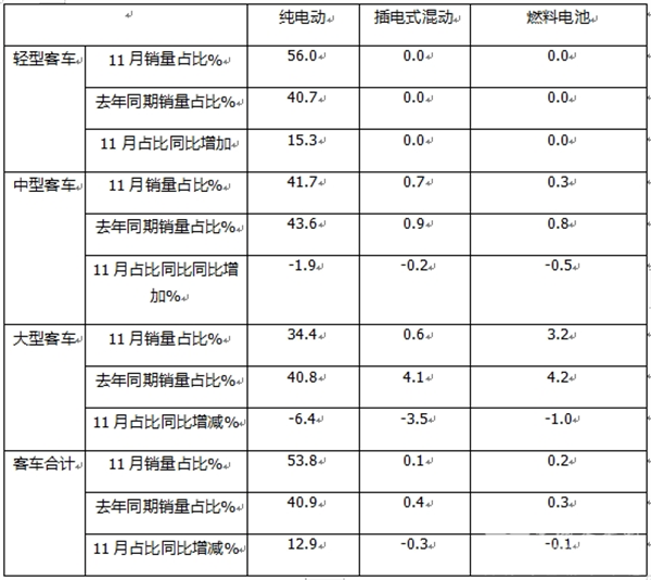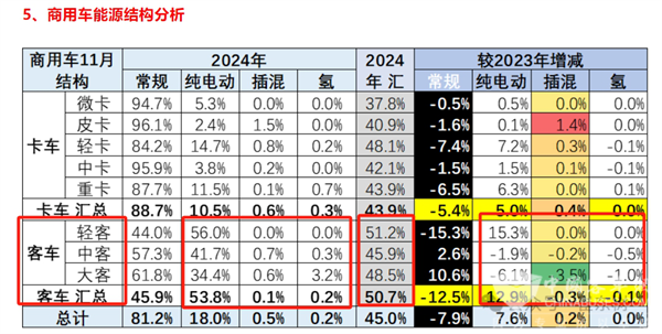 1、在2024年11月客车整体市场,各技术路线新能源车型占比及占比同比增减: