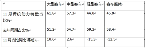 上表可见,在2024年11月国内客车市场中,传统动力占比及占比变化: