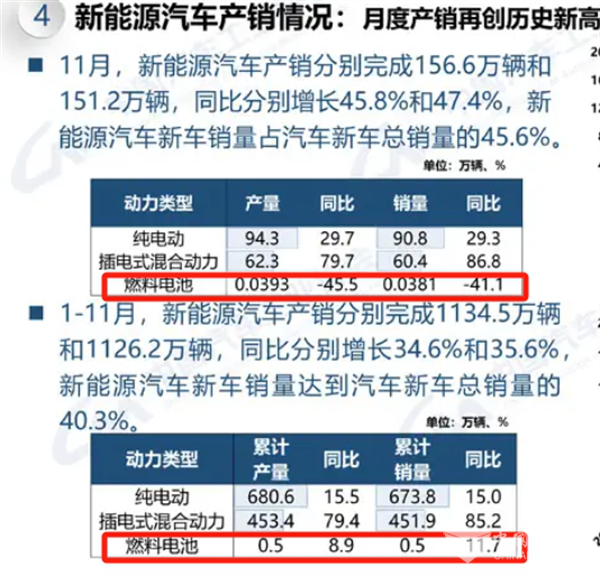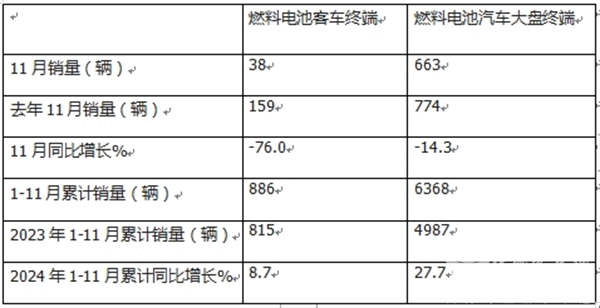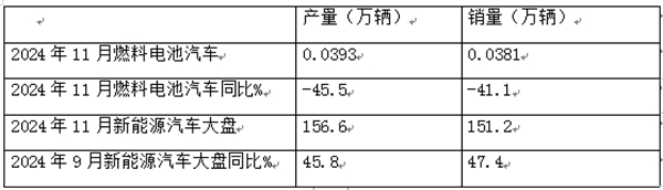 截图1,2024年11月及1-11月燃料电池汽车产销及同比(数据来源:中汽协)