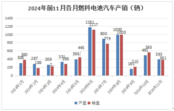 从上图表可见,在今年1-11月的各月燃料电池汽车产销量中,2024年11月产量为393辆,居今年前11月各月第六,处于中等水平;2024年10月燃料电池汽车的销量为381辆,居2024年1-11月各月销量第五。可见2024年11月燃料电池汽车产销量均居今年1-11月各月中等水平,说明今年11月燃料电池汽车市场在今年以来各月中表现非常一般。