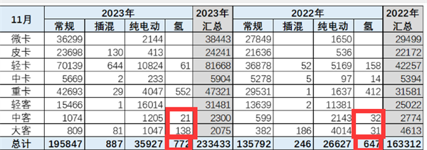 根据终端上牌数据,2024年11月我国燃料电池客车销售38辆,同比2023年11月的159辆(见截图2,138+21=159)下降76%;跑输今年11月燃料电池汽车终端大盘14.3%的降幅(终端上牌数据显示,2024年11月燃料电池汽车销售663辆,同比下降14.3%,其中燃料电池客车销售38辆,同比下降76%)。