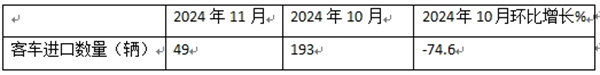 表1,根据中国汽车流通协会提供的海关数据,2024年11月我国客车进口数量环比下降74.6%: