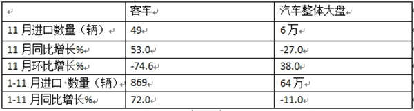 今年1-11月我国客车累计进口数量869辆,同比增长72%,跑赢今年1-11月我国客车进口大盘-11%的同比增速近83个百分点;
