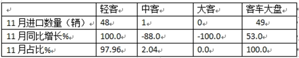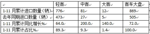 总之,在今年1-11月客车进口市场中,轻客车型进口数量占比近9成领跑;中客车型暴涨2倍而领涨。