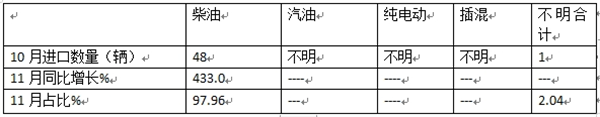 综合上述分析可见,今年11月我国客车进口市场同比大涨、环比大降;今年1-11月我国客车累计进口市场同比增长72%,且跑赢我国汽车进口大盘;其中轻客进口均最多。从进口车型动力种类看,今年11月及1-11月均是柴油类车型进口最多。