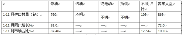 前11月我国客车进口:同比增72% 轻客领跑\中客领涨 柴油占比近9成