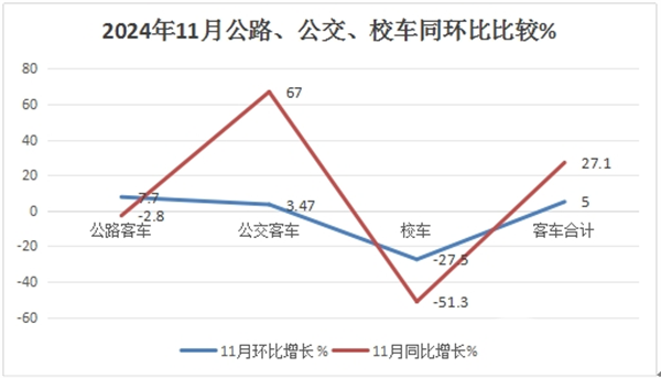 上图表可见,在2024年11月5米以上公路、公交、校车三大细分市场中: