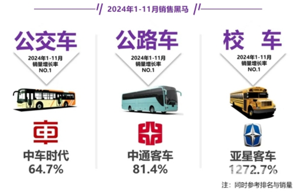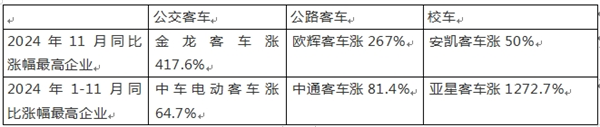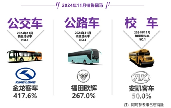 从竞争格局来看,2024年11月公交、公路、校车“黑马”分别是金龙、欧辉和安凯客车。