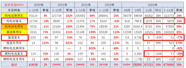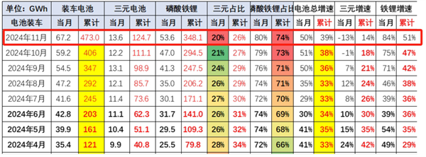 根据中国汽车流通协会提供的数据(见截图1),2024年 11月我国动力电池装机量共计67.2GWh,同比增51%;