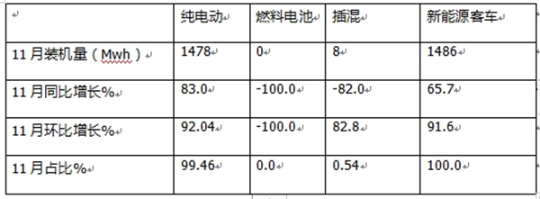 11月新能源客车动力电池装机量:纯电动同环比“双增”且“双领涨”大盘