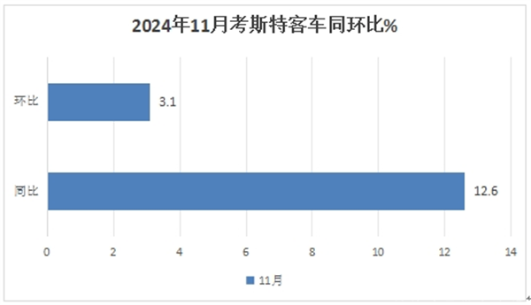 根据终端上牌数据,2024年11月考斯特客车销售1639辆,同比增长12.6%,环比增长3.1%,呈现同环比双增,说明今年11月考斯特客车市场升温。
