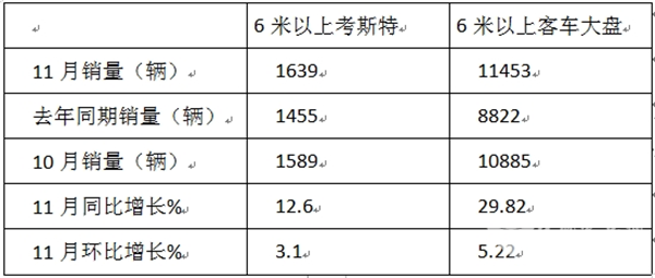 正是上述两个因素的叠加作用,导致今年11月考斯特客车市场同环比均跑输6米以上客车大盘。