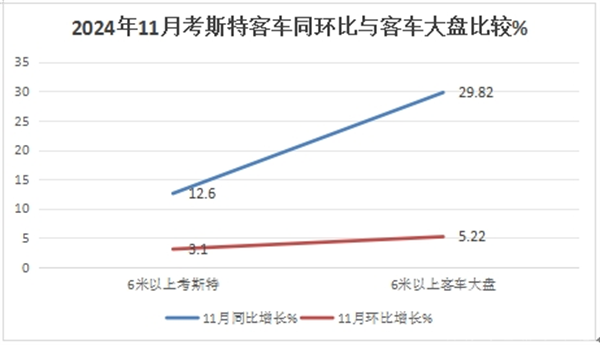表1,根据终端上牌及中国客车统计信息网数据,2024年11月考斯特客车与6米以上大中型客车大盘同环比比较: