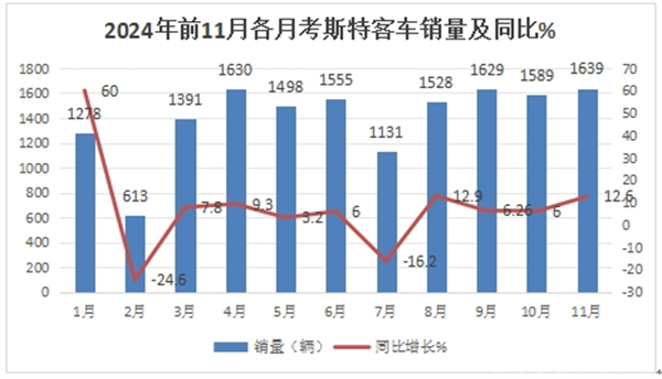 根据终端上牌数据,2024年1-11月各月考斯特客车销量及同比: