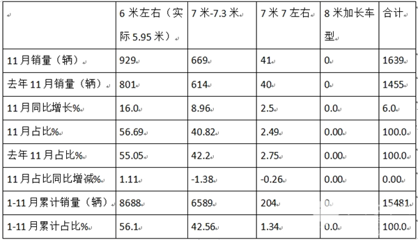 从各米段车型占比同比增减看,6米段占比同比增加1.11个百分点,是今年11月占比同比增加最多的米段车型。