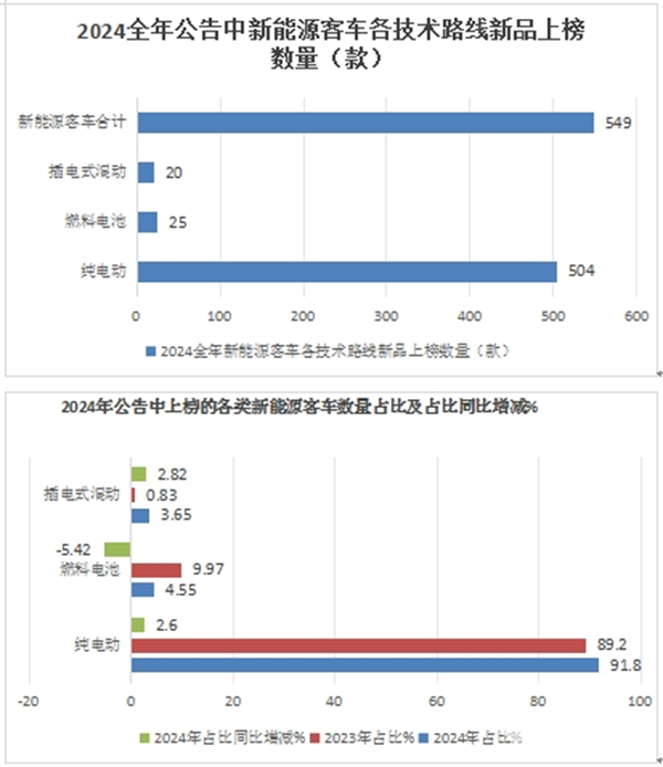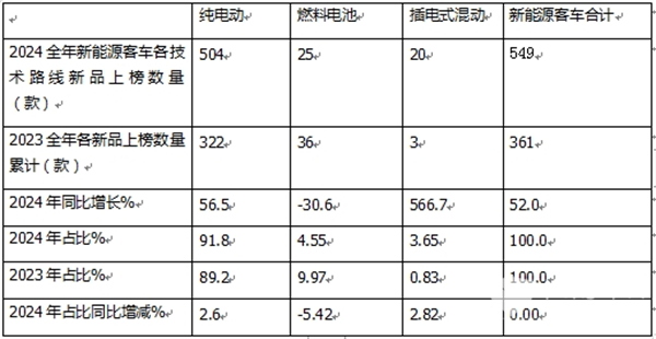 上图表显示,在2024年全年各技术路线新的能源客车上榜数量中: