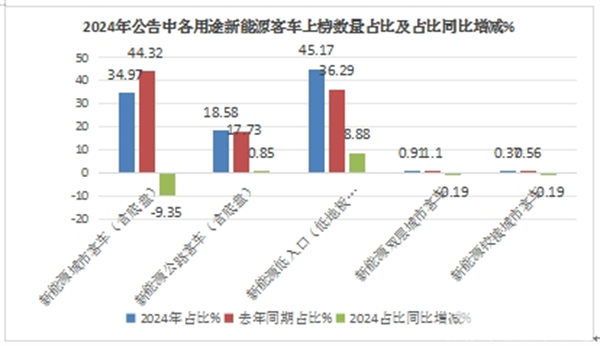 上两图可见,在2024年全年新能源客车新品公告中,按用途划分的各类新能源客车新品上榜数量占比及占比同比变化特征: