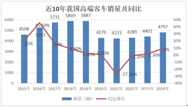 根据公开数据统计,近10年我国90万以上高档客车销量及同比增幅: