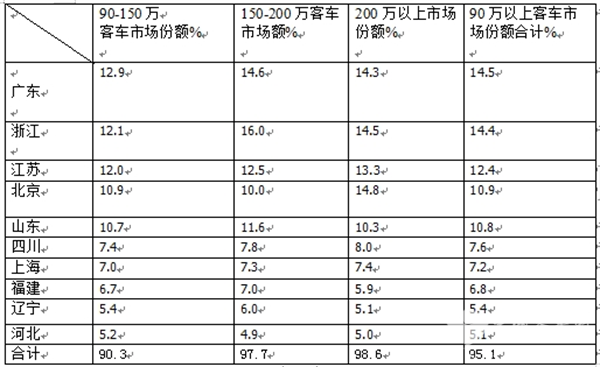 1、广东、浙江、江苏等10个区域市场是90万以上高档客车市场的主要需求市场,集中度比较高。需求比例占整个高档客车市场的95.1%。