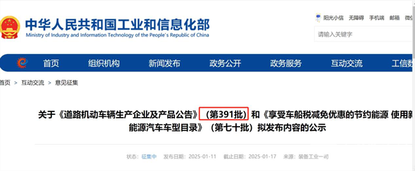2025年1月11日,工信部发布关于《道路机动车辆生产企业及产品公告》(第391批公告,下也称“本批次公告”),这是2025年以来工信部发布的第1个批次的汽车新车产品公告。